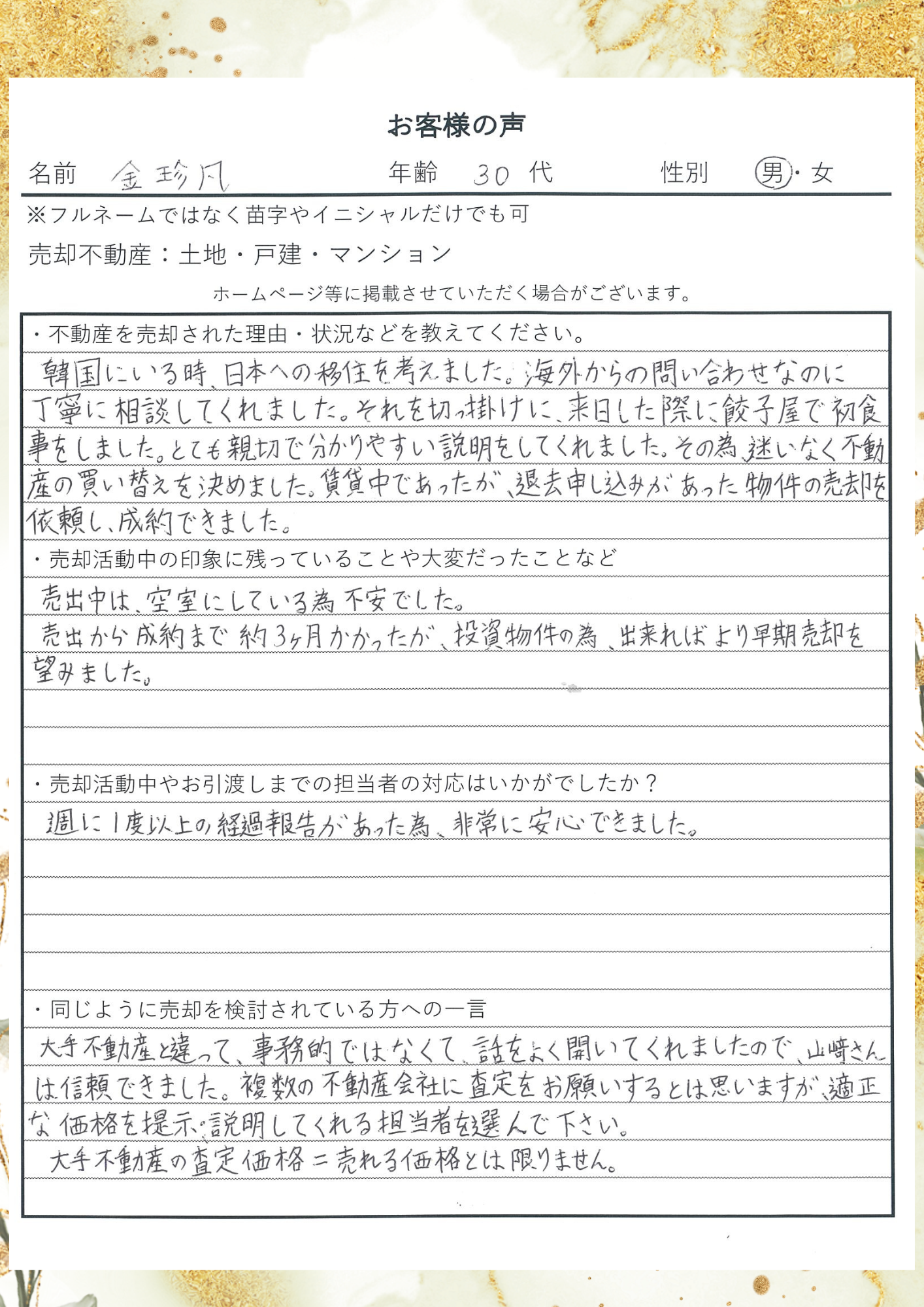 韓国にいる時、日本への移住を考えました。海外からの問い合わせなのに丁寧に相談してくれました。